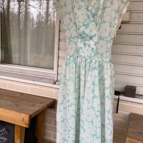 Ihanan värikäs ja persoonallinen vintage-mekko, 50-60-luvulta, arviolta L-kokoinen. Itse/ käsin ommeltu. Ostettu Berliinistä vintage-vaatteita myyvästä liikkeestä jokunen vuosi sitten. Sopii juhlaan tai esim. taidenäyttelyn avajaisiin ja muihin kulttuuririentoihin ilopilkuksi. Kaunis leikkaus miehustassa. L-kokoisen (40) päällä kuvissa, mutta menee hyvin M-kokoisellekin.