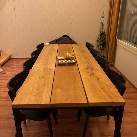 Ihana uniikki kärrynpyörä pöytä lasikannella + 4 kappaletta kaareva tuoli, jotka sopii yhteen, näin ollen pöydän ympärille mahtuu useampi henkilö tarvittaessa. Tuolit menevät myös mukavasti pöydän alle. Lisäksi mukaan 1 kpl ”kuninkaan tuoli”, jolla varmistaa itselleen johtajan paikan pöydän äärestä. Itsellä ollut myös keinutuolit käytössä pöydänääressä, mutta kuvan keinutuolit eivät sisälly hintaan. Halkaisi 109 cm. Tuutko hakee?
