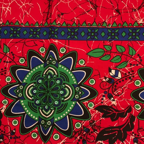 Kangas Tansaniasta (kitenge). Vahapainatus. Noin 115 cm x 350 cm. Voimakkaat värit.