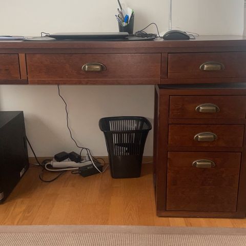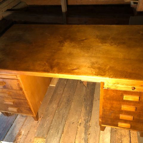 Vintage työpöytä Billnäs Bruk, jossa tammitaso työpöytä ja kaksi eri laatikostoa. Selkeää kulumaa pöydän pinnassa.