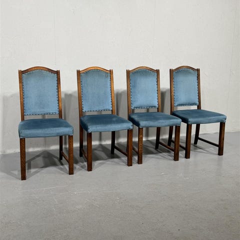 Neljä vintage-tyylistä tuolia, joissa on sininen verhoilu ja koristeelliset niitit selkänojassa. Tuolit ovat tukevat ja niissä on puurunko.