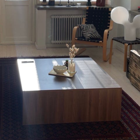 Valkoinen sohvapöytä maitolasilevyllä, jossa avotila säilytystä varten. Pöytä on suorakulmainen ja sopii olohuoneeseen tai muuhun oleskelutilaan.