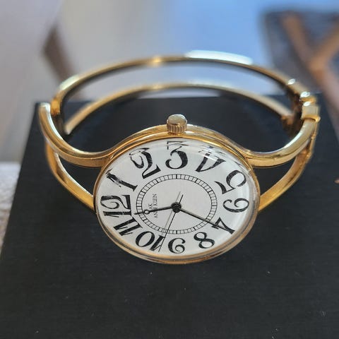 Hopeanvärinen rannekello, valkoinen kellotaulu ruusunkultaisilla yksityiskohdilla. Kello on kuin uusi, naarmuton. Kello ollut käytössä 16,5cm paksussa ranteessa, mukana tulee myös kaksi palaa, millä kelloon saa lisää ympärysmittaa. Patteri loppunut, mutta vaihto maksaa vain n. 5-10€. Mukana myös säilytysasia, missä pieni naarmu kannessa.