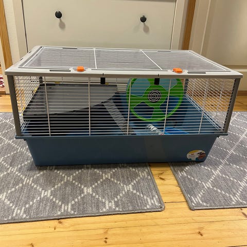 Kaksi kappaletta hamsterin häkkejä mitoiltaan 71 x 46 x 31,5. Lisäksi mukana juomapullot (käyttämättömät), posliiniset ruokakipot, muoviset kopit ja yksi kuljetushäkki. Olleet käytössä yksillä kääpiöhamstereilla. Kunto erinomainen. Koko setin yhteishinta 100 e, yksittäin ostettuna 60 e.