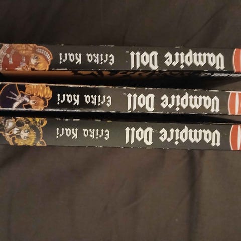 Myydään Vampire Knight -manga, suomeksi siis tässä koko sarja, eli osat 1-19. Kirjoissa pientä hyllykulumaa ja ainoa isompi huomio on kuvassa 4 näkyvä pieni repeämän alku yhden kirjan (olisko ollut numero 4) takakannessa.