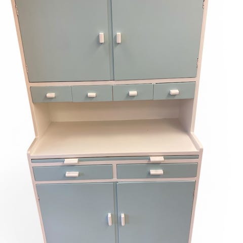 Vaaleanpunainen kaappi, jossa yläosassa lasiovet ja alhaalla kaksi laatikkoa sekä kaksi kaappia. Sopii säilytykseen ja esillepanoon esimerkiksi keittiössä tai ruokailutilassa.