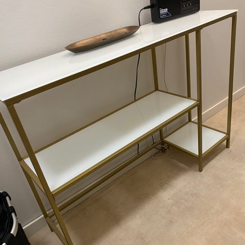 Korkeakiiltoinen senkki, lasikansi päällä. 180х42х64. Valkoiset jalat. Osittain purettu