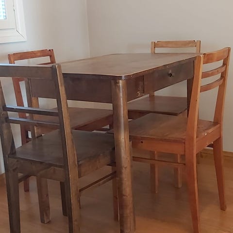 Ruokapöytä ja 4x tuolit. Pieni jatko pöydässä. Kaipaa hiomista ja lakkaa jos haluaa uutuuden tuntua. Jostain 40-50 lukujen ajalta. 50€/tarjous