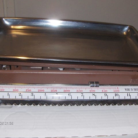Kirkkaanpunainen keittiövaaka, merkki tuntematon. Tyyli retro.