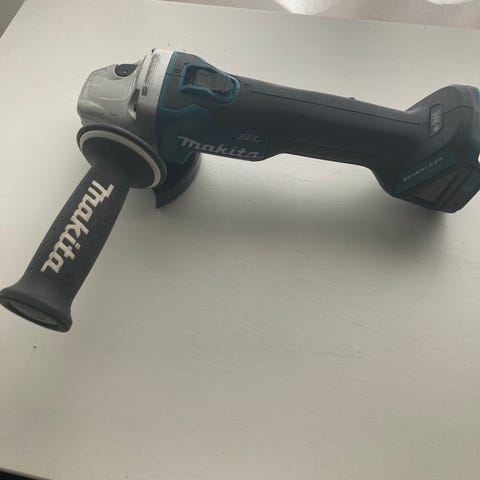 Makita-kulmahiomakone levyllä. Laite käynnistyy ja toimii, mutta akselissa on pieni välys (en tiedä, onko se tämän tyyppiselle työkalulle normaalia vai ongelma)