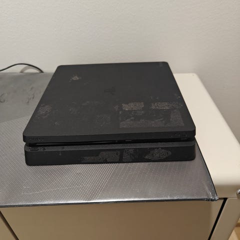 Sony PlayStation 4, mukaan ohjain ja virtajohto. Konsoli toimii muuten normaalisti, mutta dvd-asema sylkee levyn ulos. Konsoli myös yrittää poistaa asemasta levyä, vaikkei siellä sellaista ole. Ymmärtääkseni tämä on korjattavissa oleva ongelma, eli joku noheva saanee tästä halvalla ja pienellä vaivalla itselleen kelpo koneen.