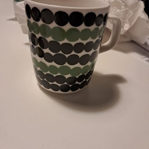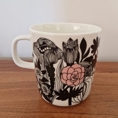Marimekko muki, jossa on punainen, musta ja valkoinen pallokuviointi.