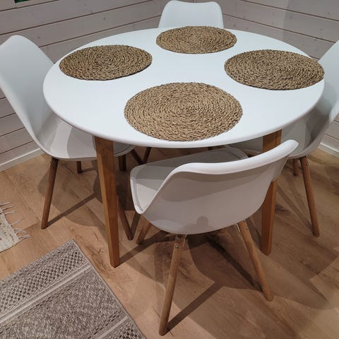 Myydään pöytä. Halkaisija 115cm. Korkeus 72 cm. Jatkettava malli mutta jatkopala hukassa. Kannen lakkaus kulunut.