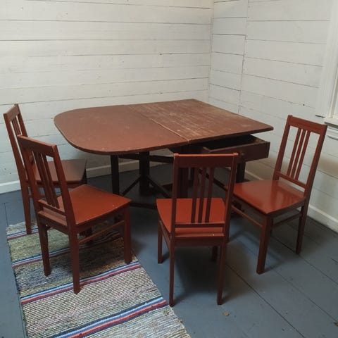 Kuvien ehjä klaffipöytä. Maalattu jossain kohtaa ruskeaksi. Kooltaan 174*111 cm (avattuna) ja 81,5 cm korkeus. Kiinni mitat 111*34 cm. 325€ / tarjous.