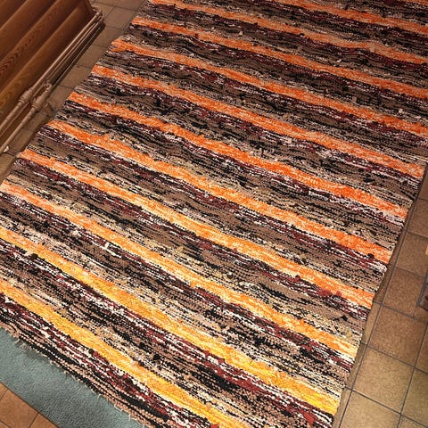 Hieman tummentumia maton vaaleassa reunaosassa. Myös punaista väriä pieni laikku.