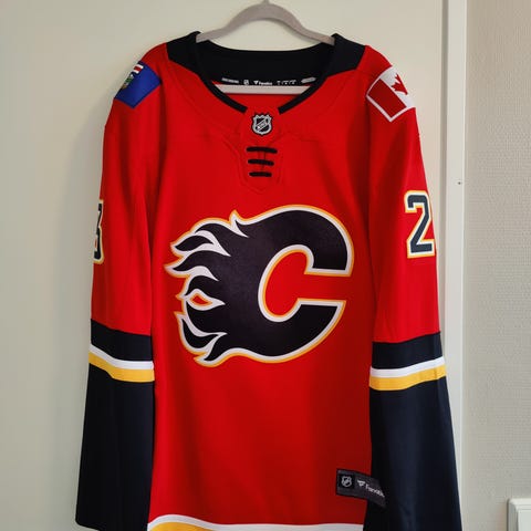 NHL Calgary Flames jääkiekkojersey, valmistettu 100% polyesteristä. Värit punainen ja musta. Valmistettu Kanadassa.