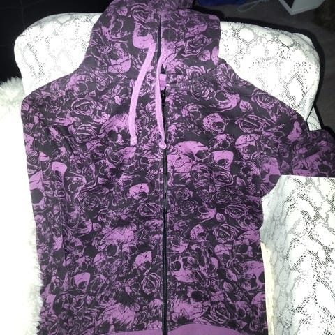 Kotimainen Ehta huppari jakku. Joustavaa puuvilla trikoota. Sinapin värinen pohja, muut värit: valkoinen, liila, vihreä ja musta. Luonto, metsä kuvioita. Kahden napin kiinnitys ylhäällä ja helma takaata pidempi. Levenee hieman alaspäin. Vastaa kokoa M-L. Käytetty vaate.