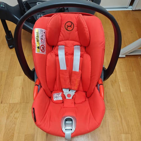 Cybex Platinum-sarjan Cybex Cloud Z-turvakaukalo. Menee 87cm/13kg asti. Luonnollisesti kolaroimaton. Ehjä ja siisti, toki käyttö näkyy. Kääntyvä kahva. Kaukalon saa makuuasentoon (ei autossa), eli pidemmätkin reissut kaupungilla onnistuu. Sivuille avautuvat törmäyssuojat. Adaptereilla saa vaunuihin. Avattava aurinkosuoja. Irrotettava newborn-koroketyyny.