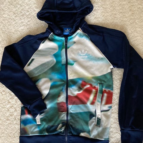 Adidas hupullinen takki, jossa vetoketjulliset taskut. Paksuhko puuvillakangas (62%), jossa elastaania. Minimalistinen, selkeä malli.
