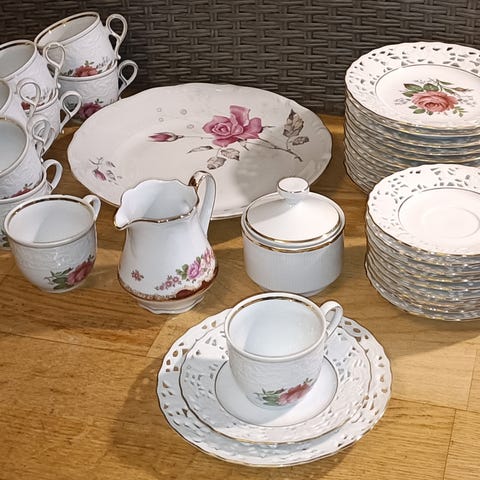 Siisti ja hyväkuntoinen, ruusukukka posliini kahviastiasto tarpeettomana!