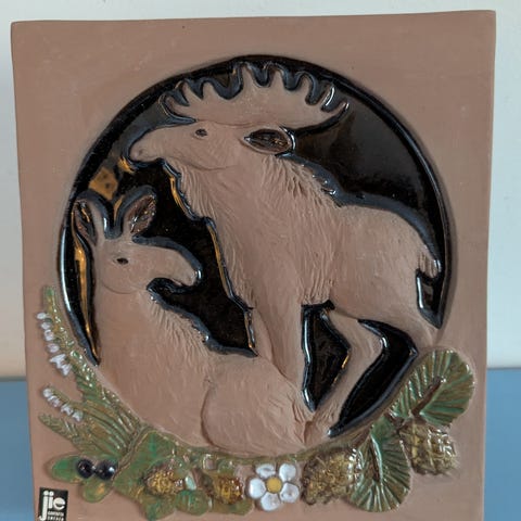 Vintage JIE GANTOFTA keraaminen seinälaatta "Den kringbyggda Gården", jossa näkymä ikkunasta ulos. Design Aimo Nietosvuori, Ruotsi, 1960 tai 1970-luku.