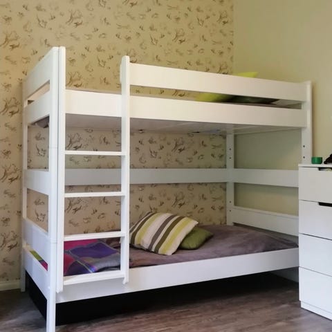 Puinen kerrossänky, valkoinen. Alapeti 120cm leveä, yläpeti 80cm leveä. Pituus 208cm, korkeus 131cm. Pientä käytön jälkeä ja kulumaa, ei kuitenkaan mitään silmiinpistävää. Yksi alapedin reunan pohjalaudoista poikki, ei vaikuta käyttöön. Tästä erikseen kuva.
