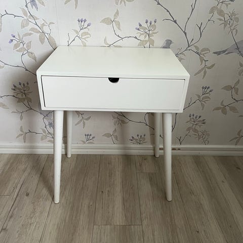Ostetaan kuvan mukainen yöpöytä. Alunperin jyskistä ostettu, mutta nykyään ei enää myynnissä. Jalat oli alkuperäisesti ruskeat, mutta maalattu itse mustaksi. Jos sinulla olisi tälläinen tai vastaava, niin tarjoa! Voin hakea pk-seudun lähettyviltä.