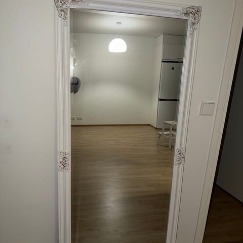 Peili, jossa on koristeelliset yksityiskohdat kehyksessä. Peilin koko 162x72cm. Kiinnitys onnistuu pystyyn tai vaakaan. Nouto Kellokoskelta.