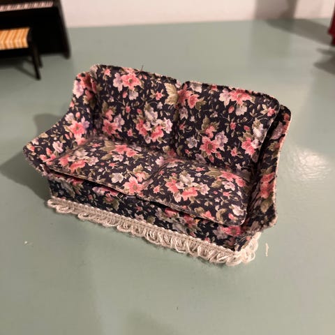 Lundby nukkekoti rokokoo sohva 70-luvulta. Hyväkuntoinen, pieni maalikuluma.