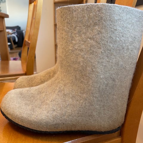 Muuten oikein hyvässä kunnossa, mutta pohjaa liimattu reunoista uudelleen ja siksi kantapäässä on pieni liimajälki (viimeinen kuva), joka ei haittaa käyttöä eikä juuri näy.