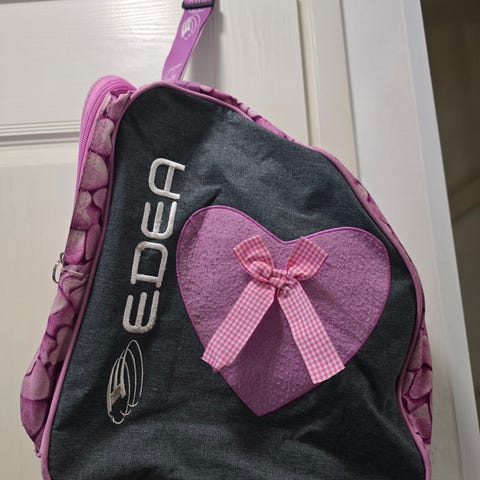 Myydään kuvan pinkki Edes luistinkassi. Paljon käytetty mutta kunto hyvä. Kassin pituus noin 33cm, leveys noin 20cm ja korkeus korkeimmasta kohdasta noin 34cm. Voi kantaa olkahihnasta tai kantokahvasta.