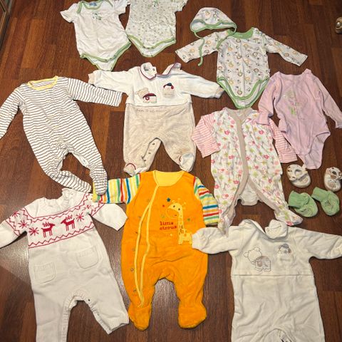 Vauvan vaatteita. Osa äitiyspakkauksesta, suurin osa So Cute, lisäksi esimerkiksi yksi Newbie. Koot 62-68. Joitakin ei ole käytetty ollenkaan, suurinta osaa käytetty muutamia kertoja. Pesty hajusteettomalla pesuaineella. Taloudessa ei ole lemmikkeitä.
