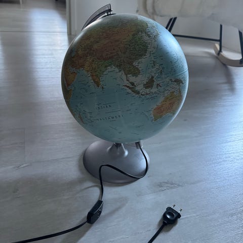 Maapallo pöytävalaisin, jossa on valkoinen ja musta väritys. Valaisin toimii pöytävalaisimena ja sen muoto jäljittelee maapalloa. Valaisin on varustettu metallisella jalustalla.