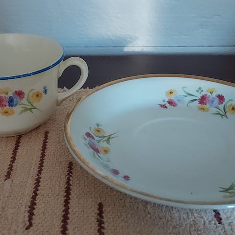 Myydään hyväkuntoinen Arabian VIOLA-kahvikuppisetti, jossa siis yksi kuppi, asetti ja leipälautanen.