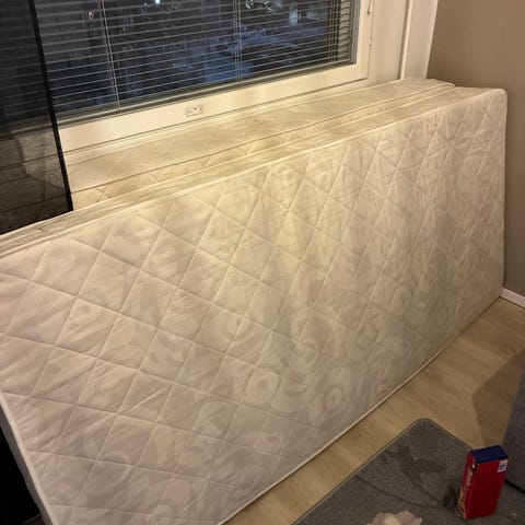 Jensen-diplomat jousipatja. 18 cm paksu patjja on pehmeä ja 90 cm leveä. Alkuperäinen suoja on korvattu muotoonommellulla lakanalla. Osa kuvista on otettu ilman lakanaa. Petauspatjaa ei tule mukaan. Sisällä on jouset, jotka tuntuvat toimivan hyvin, ei narise tai naksu.