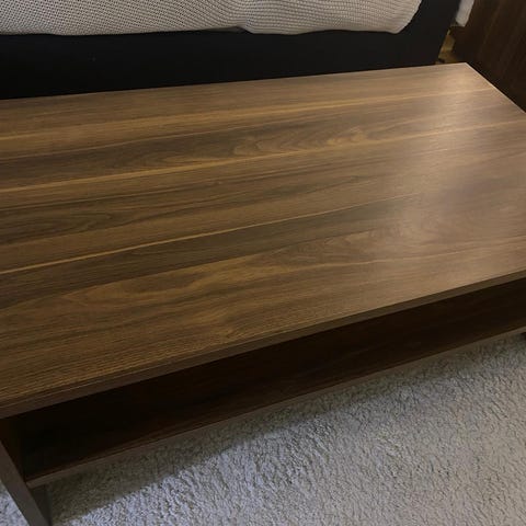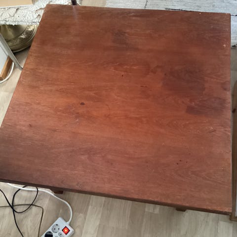 Upea pähkinänvärinen olohuoneen pöytä. Laadukas ja tukeva. Jalat irroitettavissa. Valmistettu Suomessa. Mitat 70x115x48cm.