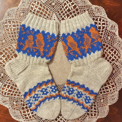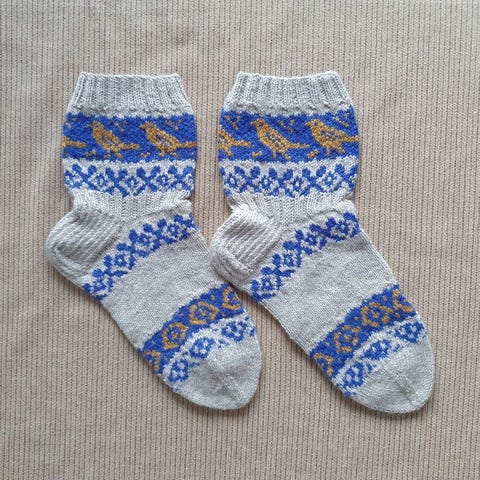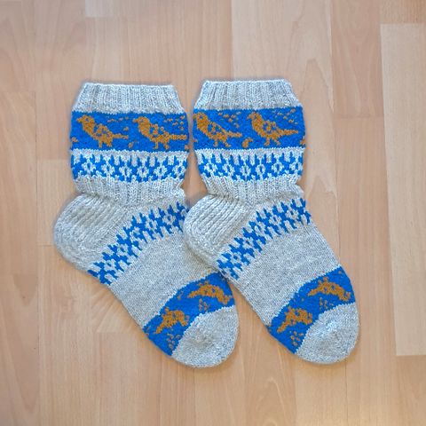 Käsin neulotut uudet villasukat. Lanka Novita 7 veljestä, 80 % villaa, 20 % polyamidia, vahvistettu kantapää. Pesu 40 asteessa, kestää konepesun. Sukan varren pituus kantapäästä on 22 cm ja terän pituus kantapäästä kärkeen 27 cm.