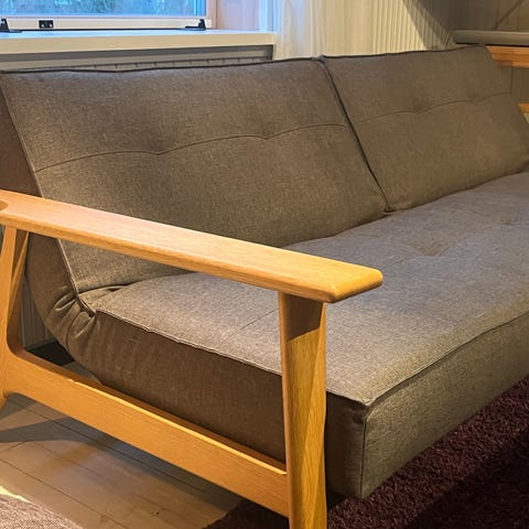 Innovation Design Splitback vuodesohva. Selkänoja kahdessa osassa, ja molemmissa selkänojissa kolme asentoa (pysty, puolipysty ja vaaka). Erittäin hyvässä ja siistissä kunnossa oleva tukeva sohva. Ei ole eläintaloudesta.