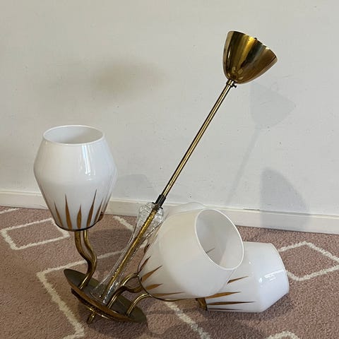 Kaunis valaisin, jossa kolme lasipalloa. Kahdessa pallossa säröä, joista kuva. Pallot pysyvät koossa.
