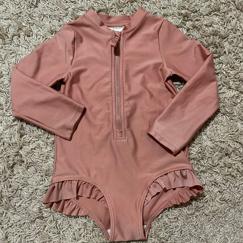 Tytölle ultraviolettisäteilyä estävä uimapuku ja lakki.