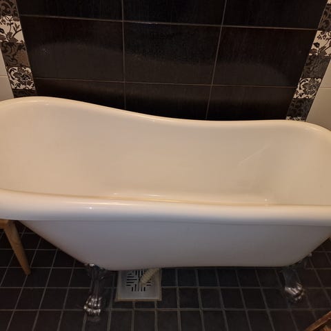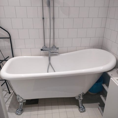 Valkoinen ja siisti tassuamme. Ammeessa on kaareva muotoilu ja se soveltuu sisätiloihin. Ammeessa on muovinen poistoputki, jonka kautta veden saa laskettua lattiakaivoon. Poistoputken liitoskappale vuotaa hieman, ei vaikuta kylpemiseen.