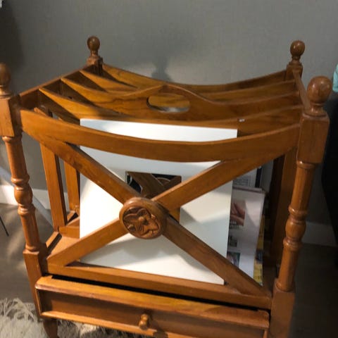 Puu lehtiteline ruskea. Lehtiteline on valmistettu puusta ja siinä on pystysuorat tangot lehtien säilytykseen. Väri ruskea.