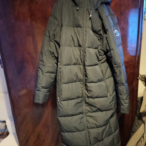 Vihreä untuvatakki. Kaksisuuntainen vetoketju. Irrotettava huppu, hupun reunassa irrotettava karvareunus. Lumilukot hihansuissa, kiristys vyötäröllä.