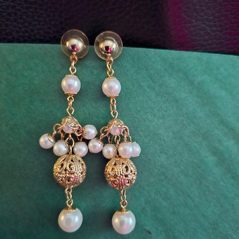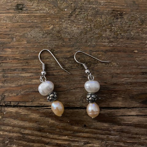 Kahdet helmikorvakorut. Harmaat helminappikorvakorut ja vaaleanpunavalkoisen roikkuvat.