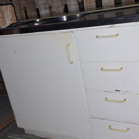 Annetaan kuvanmukainen keittiön alakaapisto. Toisessa sivussa johdoille tehty reikä ja toisessa sivussa muutama ruuvinreikä. Tasossa ei mitään silmiin pistävää jälkeä, päällä ollut pleksi. Vaikka autotalliin tms. varastokäyttöön. Nopea haku, muutoin lähtee kaatopaikalle lähipäivinä.