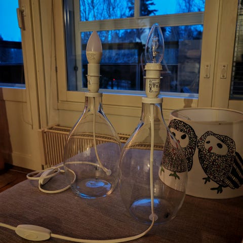 Nätit valaisimet, molemmat toimii. Korkeus noin 25 cm ja merkki muistaakseni Ikeasta.