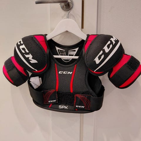 CCM rintapanssari koko yth L (sopii 117-127cm pituiselle, meillä ollut käytössä sirolla 135cm pelaajalla), ja Bauerin kyynärsuojat koko yth L.