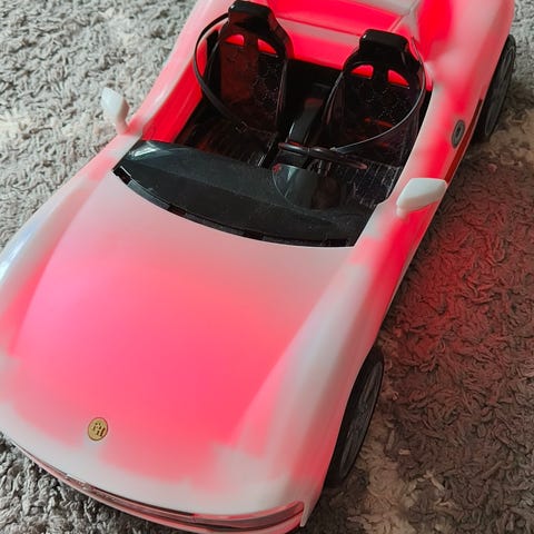 Siistissä käytetyssä kunnossa oleva barbie, auto ja koira