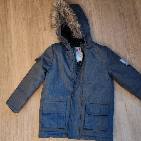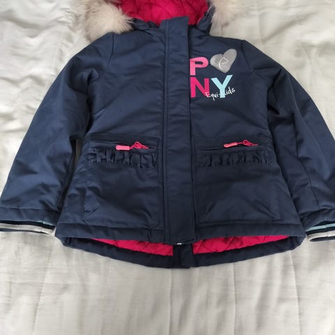 Hupullinen lämmin toppatakki joka sopii tytölle tai pojalle. Käytetty vain pari kertaa kun lapsi tykkäsi haalarista enemmän. Hupun tekoturkis irrotettavissa. Merkki: Ciraf.