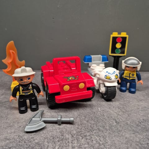 LEGO DUPLO City pelastusajoneuvot ja hahmot sisältävät ambulanssin, poliisiauton, moottoripyörän, liikennevalot, liikennemerkit ja useita hahmoja. Yksi hahmo puuttuu ja sen sijaan lisätty poliisisetti. Kunto on hyvä, ei ohjetta, sopii hyvin leikkiin.